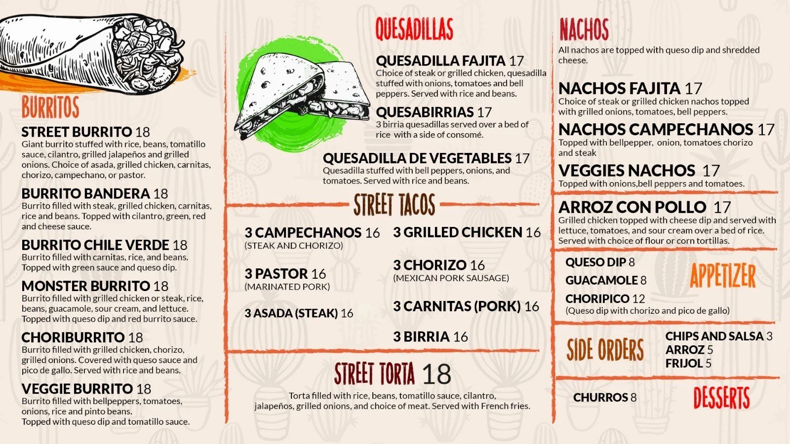 Over sized quesadilla stuffed with steak, grilled chicken, shrimp, chorizo, carnitas, onions, tomatoes, bell peppers, zucchini, and mushrooms. Served with rice and beans. All quesadillas come with cheese.